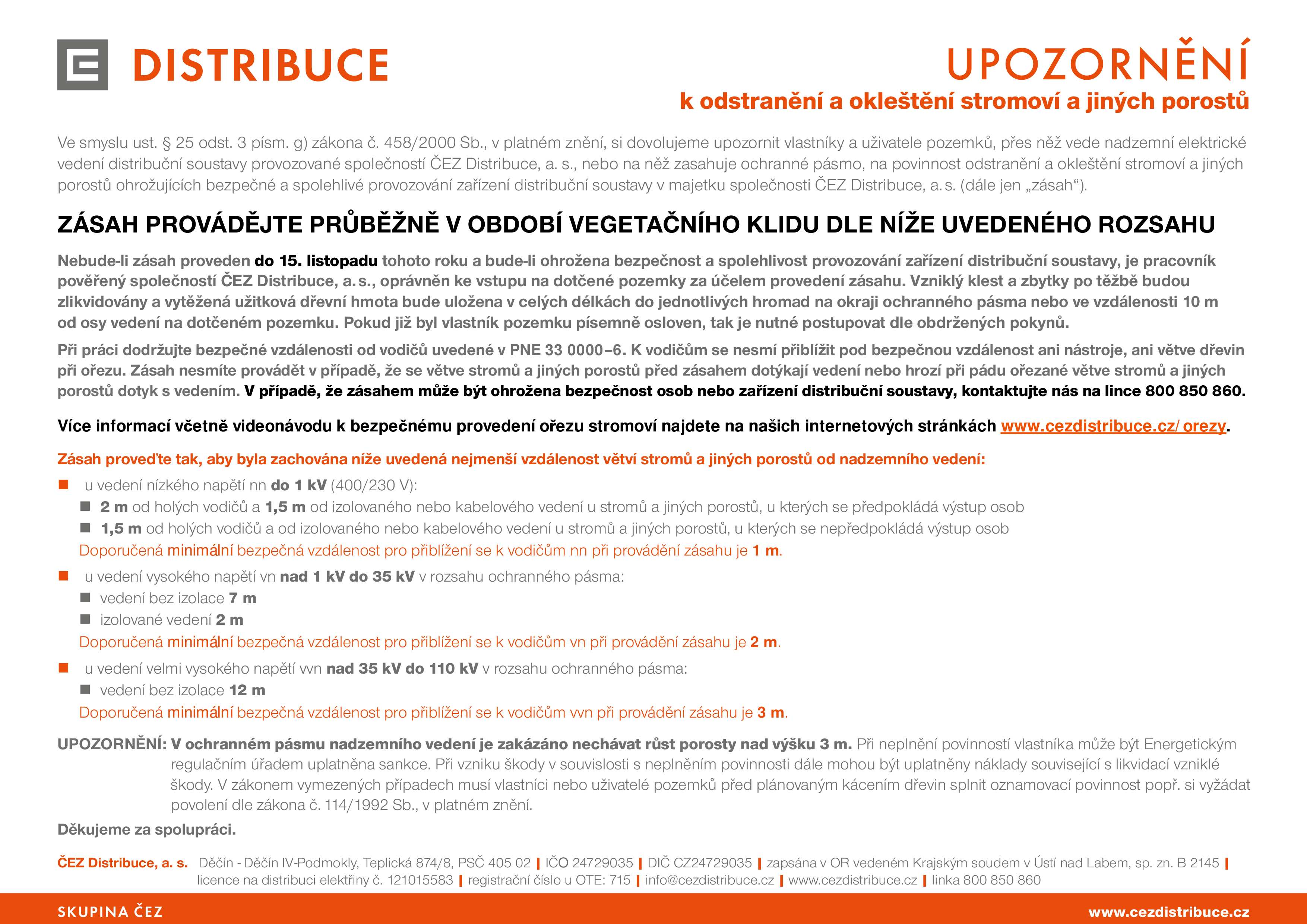ČEZ - UPOZORNĚNÍ K ODSTRANĚNÍ NEBO OKLEŠTĚNÍ DŘEVIN